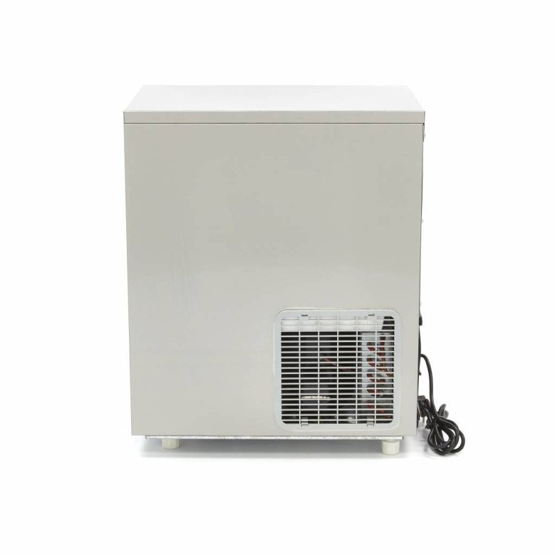 Diese professionelle Eismaschine ist an der Rückseite luftgekühlt und sollte nicht in zu warmen Räumen verwendet werden. Auf dem Bedienfeld befinden sich mehrere Kontrollleuchten. die Sie auf einen vollen Vorratsbehälter. einen zu niedrigen Wasserstand oder auf Fehler und Störungen hinweisen. Dies ist wichtig. damit Sie genau wissen. welche Maßnahmen Sie ergreifen müssen. damit die Produktion von Eiswürfeln so schnell wie möglich fortgesetzt werden kann. Außerdem ist der Eiswürfelbereiter mit einem Überlastungsschutz ausgestattet. so dass Sie sicher weiterarbeiten können und sich keine Sorgen um eine Überlastung des Geräts machen müssen. Das effiziente Kühlsystem sorgt dafür. dass die Eiswürfel gut geformt und von hoher Qualität sind. Das für diese Maschine verwendete Kältemittel ist R290. Diese professionelle Eismaschine wird mit Versorgungsschläuchen geliefert. die an eine Trinkwasserversorgung angeschlossen werden müssen. Die Eismaschine ist nicht mit einer Ablasspumpe ausgestattet. Der Ablassschlauch sollte tiefer als der Auslass der Maschine angeschlossen werden.