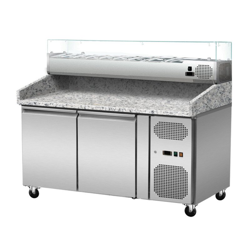 Pizza Kühltisch. Granit rosa-grau. 2 Türen. 151 x 80 Kühlaufsatz GN1/3 mit Glas