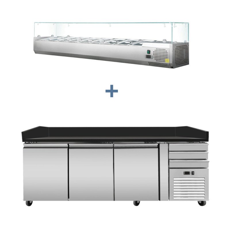 Pizza Kühltisch PRO. Granit Star Galsxy schwarz. 3 Türen + 3 Schubladen. 200 x 80 Kühlaufsatz GN1/4 mit Glas