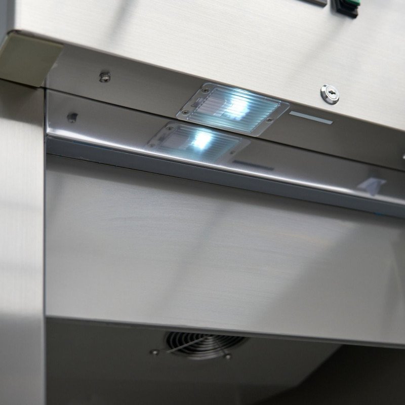 Dieser Kühlschrank verfügt über drei robuste. verstellbare Einlegeböden (55 x 53 cm). auf denen sich eine Vielzahl von Zutaten unterbringen lässt. Die selbstschließende Tür verfügt über eine antibakterielle Gummidichtung und ein Schloss mit zwei Schlüsseln für zusätzliche Sicherheit. Abgerundete Innenecken verhindern die Ansammlung von Schmutz und machen die Hygienepflege mühelos. Das Gerät ist auf vier Rollen montiert. von denen zwei gebremst sind. und lässt sich leicht und sicher bewegen. Die LED-Beleuchtung sorgt für klare Sicht auf den Inhalt. sobald die Tür geöffnet wird.