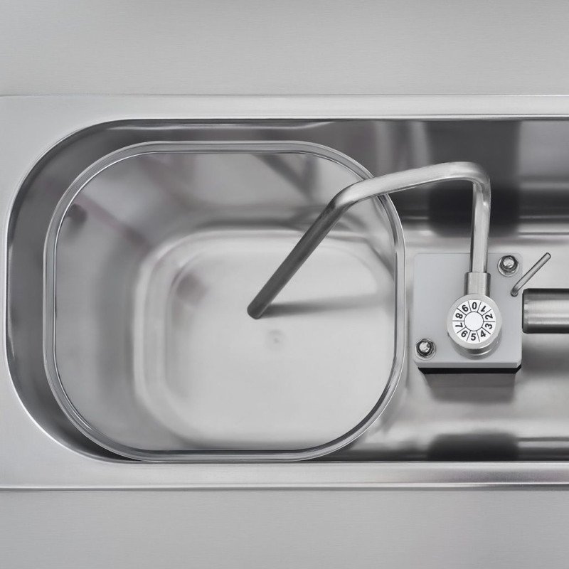 Das Gehäuse. der Tank und der Tropfschalenhalter dieser professionellen Schlagsahne-Maschine sind aus glattem Edelstahl gefertigt und lassen sich daher sehr leicht reinigen. Füllen Sie zunächst etwas heißes Wasser in den Flüssigkeitsbehälter. Halten Sie anschließend die Taste so lange gedrückt. bis der gesamte Spülvorgang abgeschlossen ist und kein Wasser mehr austritt. Alle abnehmbaren Teile können mit etwas warmem Wasser und einem milden Reinigungsmittel gereinigt werden. Spülen Sie sie gründlich mit klarem Wasser ab. bevor Sie sie trocknen und wieder zusammensetzen. Die Maschine kann auch mit dem Spülvorgang desinfiziert werden.