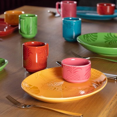 • große Auswahl an Tellern, Tassen und Tiki-Bechern