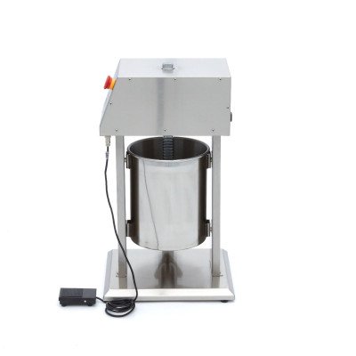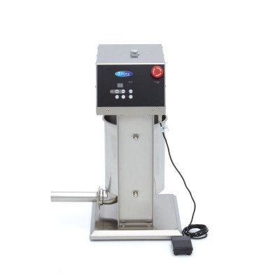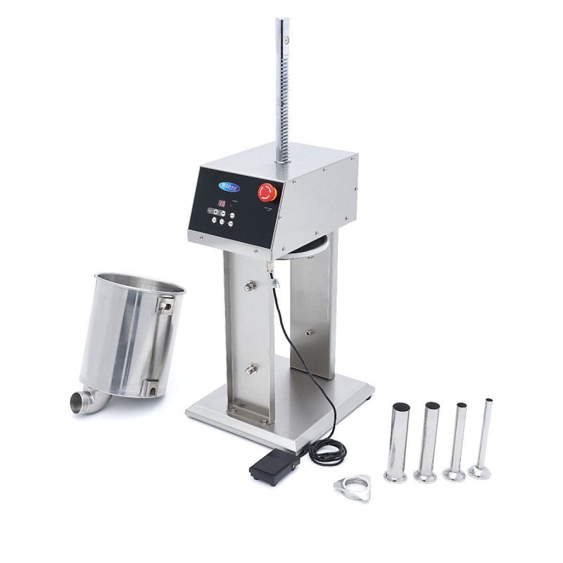 +49 (0) 6135 7040 450Füllen Sie Ihre Würste schnell und effizient mit dieser automatischen Wurstfüllmaschine. die eine Füllkapazität von 10 l bietet. Dieser professionelle Wurstfüller ist komplett aus Edelstahl gefertigt und wird mit vier Füllrohren mit 16. 22. 32 und 38 mm Durchmesser geliefert. Außerdem verfügt er über ein Fußpedal zur Bedienung des Wurstfüllers. so dass Sie die Hände zum Füllen und Wenden der Würste frei haben. Die Druckplatte dieses Geräts ist mit einer Silikondichtung versehen. die auslaufsicher und abnehmbar ist. Dieser professionelle Wurstfüller verfügt über 10 Füllgeschwindigkeiten von 0-100. so dass Sie immer die richtige Geschwindigkeit für eine präzise Dosierung haben.