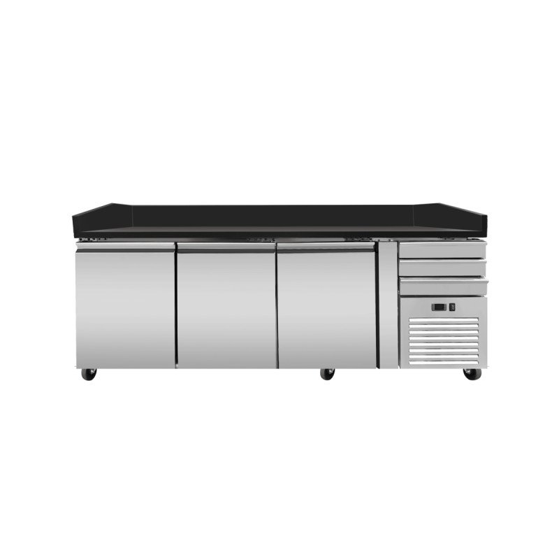 • Pizza Kühltisch PRO. Granit Star Galsxy schwarz. 3 Türen + 3 Schubladen. 200 x 80 Kühlaufsatz GN1/4 mit Edelstahldeckel